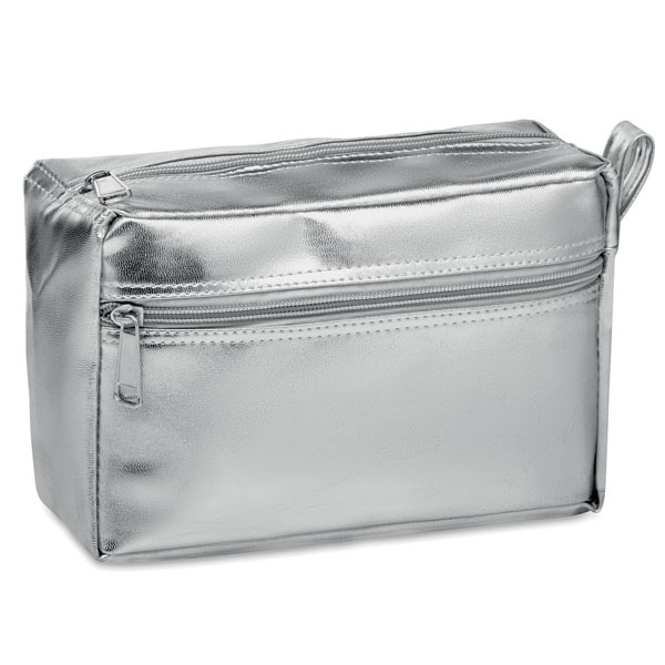 Cosmetic bag ● with double zipper ● has a shiny coating.