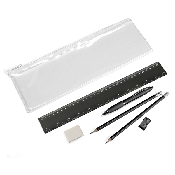 Stationery set consists of a clear pencil case â— a ruler â— a sharpener â— a eraser â— 2 standard grey lead pencils â— a ballpoint pen.